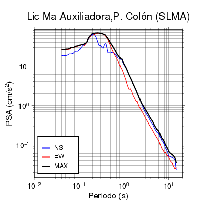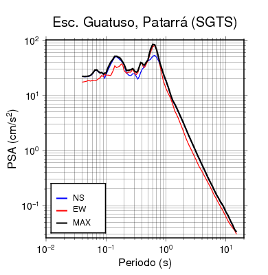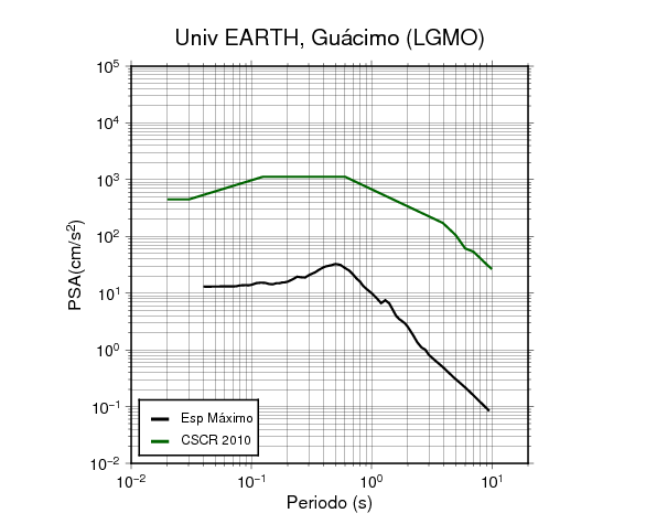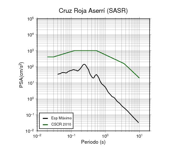 En los siguientes gráficos, la traza verde es el espectro propuesto por el CSCR-2010, la traza negra es el espectro máximo de este sismo. El valor de la amplitud está dado en pseudoaceleración en cm/s2.