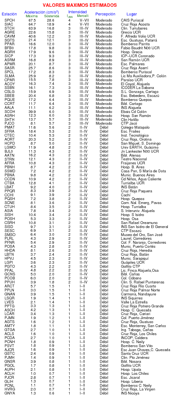 La siguiente tabla muestra los valores de Aceleración Máxima o aceleración pico (PGA por sus siglas en inglés). Este es el valor máximo en cualquiera de las 3 componentes del registro.