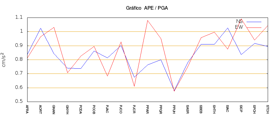 Gráficos comparativos de las aceleraciones Pico Efectiva (APE) y Máxima (PGA) para cada estación en las componentes NS y EW.