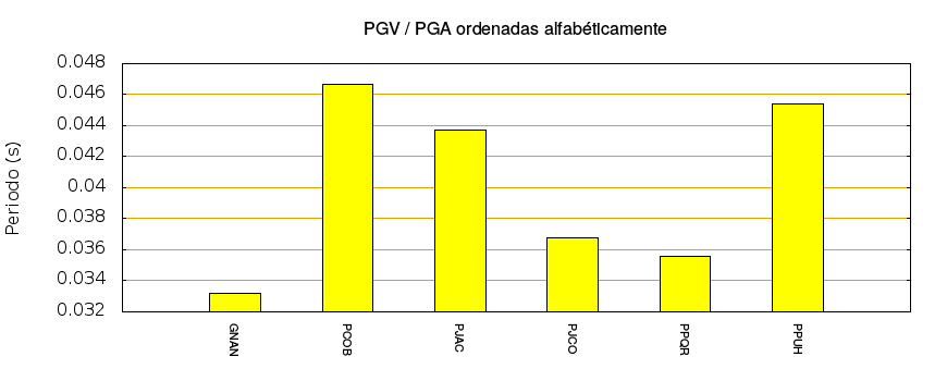 El cociente de la velocidad máxima (PGV) entre la aceleración máxima (PGA) brinda información de los periodos más significativos del movimiento del suelo. En el gráfico siguiente se muestran las estaciones ordenadas por su cercanía al epicentro. La más cercana está a la izquierda y la más lejana a la derecha. También se muestran los mismos datos en orden alfabético y ordenados de mayor a menor amplitud.