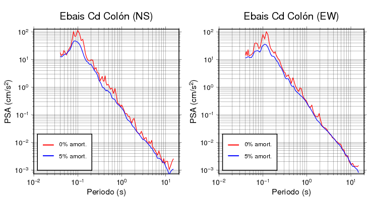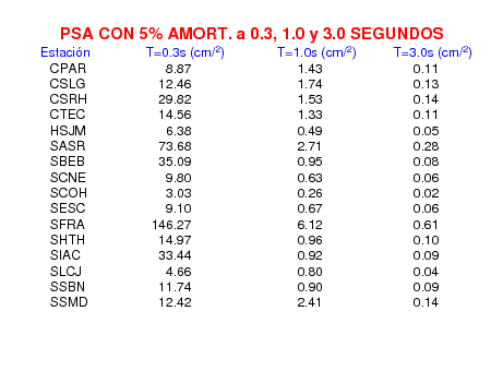 Esta tabla contiene los valores de PSA en cm/s2 calculados del espectro de respuesta con 5% de amortiguamiento a 1 segundo (se muestran los valores para aquellas estaciones que tuvieron un valor de aceleración superior a 5 cm/s2).