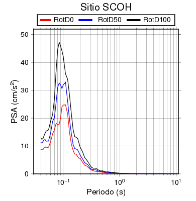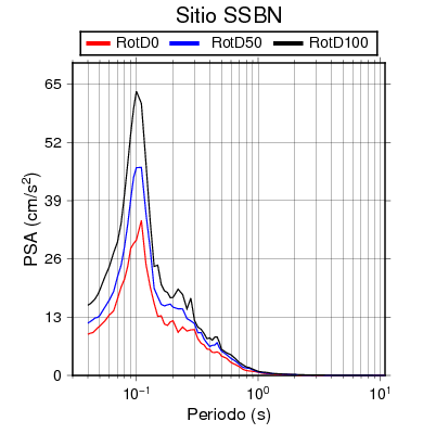 RotD50 representa un valor medio de la respuesta por lo cual se puede comparar con valores de otras medidas empleadas en modelos de atenuación como la Media Geométrica de las componentes ortogonales (GM). RotD0 y RotD100 son los valores extremos (mínimo y máximo), los cuales nos pueden servir para determinar la dispersión de la posible respuesta en cada sitio.