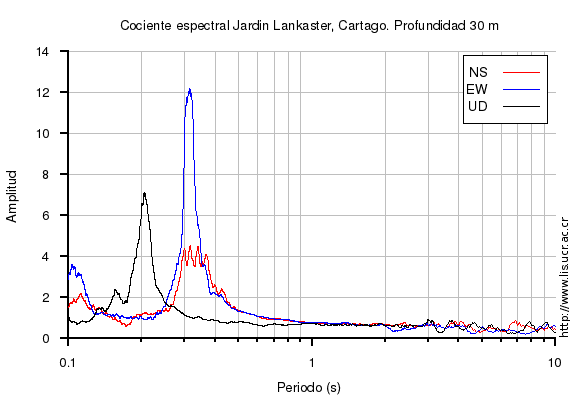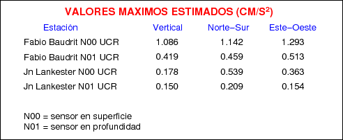 Aquí se muestran las formas de onda y cocientes espectrales de los sensores colocados en pozo . Uno se ubica en el Jardín Lankester en Paraíso de Cartago con 30 m de profundidad y el otro en la Estación Experimental Fabio Baudrit en Alajuela con 40 m de profundidad. La tabla muestra los valores de aceleración máxima (PGA) leídos de las tres componentes en superficie (N00) y en profundidad (N01)