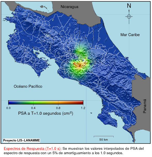 La siguiente figura corresponde al mapa interpolado de los valores de los espectros de respuesta para 1.0 s en período. La escala muestra los valores de pseudoaceleración con los valores bajos en azul y los altos en rojo. Los triángulos corresponden a la ubicación de los acelerógrafos.