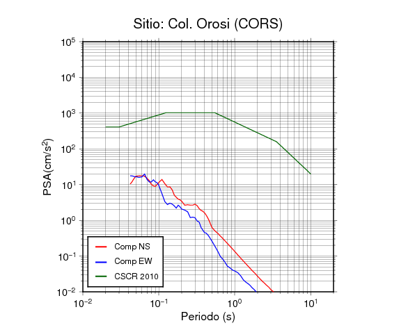 En los siguientes gráficos, la traza verde es el espectro propuesto por el CSCR-2010, la traza roja es el espectro de este sismo en la componente norte-sur (NS) y la traza azul la componente este-oeste (EW). El valor de la amplitud está dado en pseudoaceleración en cm/s2.