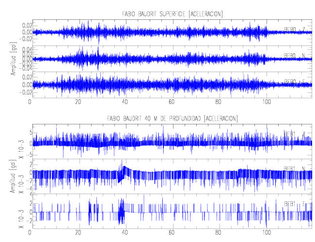 Aquí se muestran las formas de onda y cocientes espectrales de los sensores colocados en pozo . Uno se ubica en el Jardín Lankester en Paraíso de Cartago con 30 m de profundidad y el otro en la Estación Experimental Fabio Baudrit en Alajuela con 40 m de profundidad. La tabla muestra los valores de aceleración máxima (PGA) leídos de las tres componentes en superficie (N00) y en profundidad (N01)