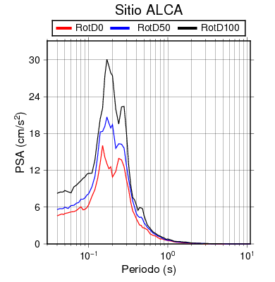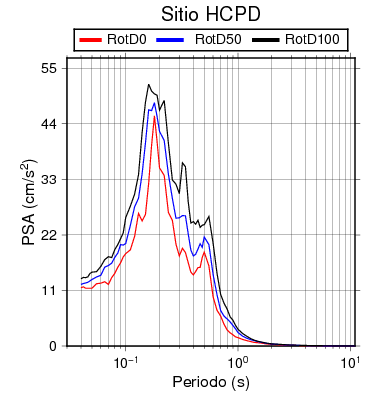 RotD50 representa un valor medio de la respuesta por lo cual se puede comparar con valores de otras medidas empleadas en modelos de atenuación como la Media Geométrica de las componentes ortogonales (GM). RotD0 y RotD100 son los valores extremos (mínimo y máximo), los cuales nos pueden servir para determinar la dispersión de la posible respuesta en cada sitio.