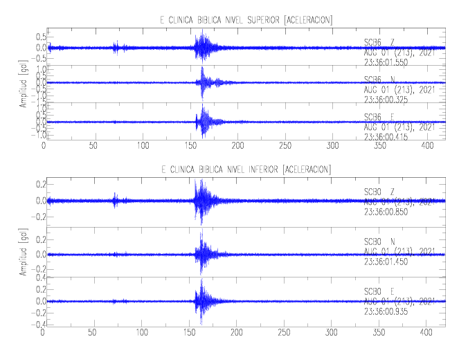 En esta sección se muestran los registros de aceleración (ac), velocidad (ve) y desplazamiento (de) de los niveles superior e inferior de varios edificios que se encuentran conectados al LIS ( http://www.estructuras.lis.ucr.ac.cr )
