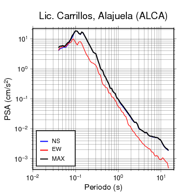 En los siguientes gráficos, la traza verde es el espectro propuesto por el CSCR-2010, la traza negra es el espectro máximo de este sismo. El valor de la amplitud está dado en pseudoaceleración en cm/s2.