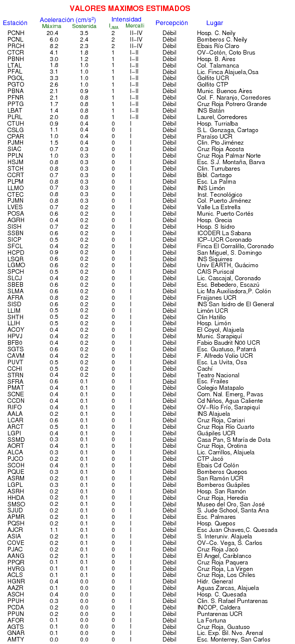 La siguiente tabla muestra los valores de Aceleración Máxima o aceleración pico (PGA por sus siglas en inglés). Este es el valor máximo en cualquiera de las 3 componentes del registro.