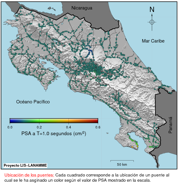 Este mapa muestra la ubicación de cada uno de los puentes sobre las carreteras nacionales en la forma de pequeños cuadrados. Estos tienen diferente color según la zona de PSA sobre la que se ubican de acuerdo al mapa anterior. (En otras palabras, los puentes se muestran según el valor de PSA dado por la escala)