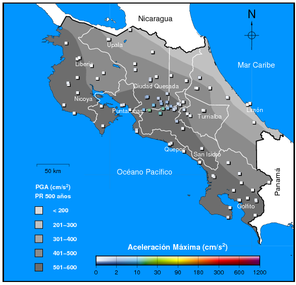 El siguiente es el mapa de amenaza sísmica para un período de retorno de 500 años. Cada cuadro es una estación acelerográfica coloreada según el valor de aceleración máxima registrado. Para este sismo el máximo fue de 17.4 gal o cm/s2.