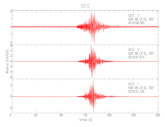 La siguiente tabla muestra los datos de aceleración máxima para cada componente en porcentaje de la aceleración de la gravedad (%g). Estos se obtienen dividiendo el valor del PGA registrado por 980 cm/s2 y multiplicándolo por 100. Los valores de las últimas dos columnas corresponden a la componente radial y transversal. Los datos se listan en orden descendente según el valor de la componente radial.
