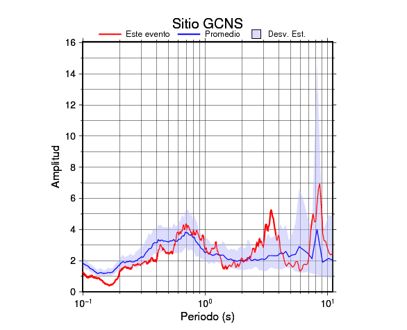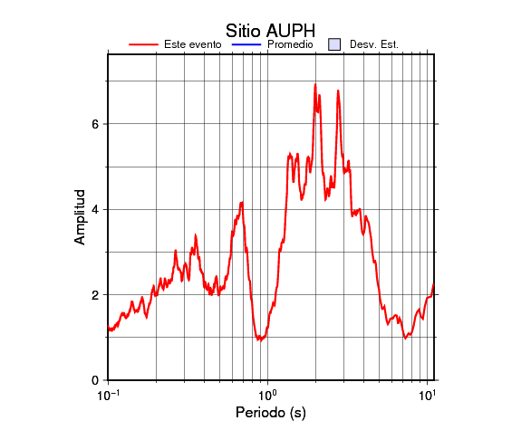 Los resultados que se presentan aquí fueron obtenidos luego de dividir las componentes horizontales entre la componente vertical (conocido como técnica H/V). Se grafica tanto el efecto de sitio del sismo registrado como el valor promedio en cada estación y su correspondiente desviación estándar.