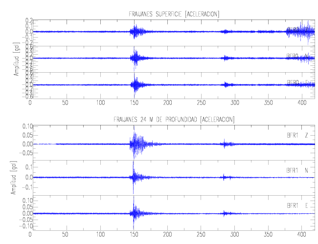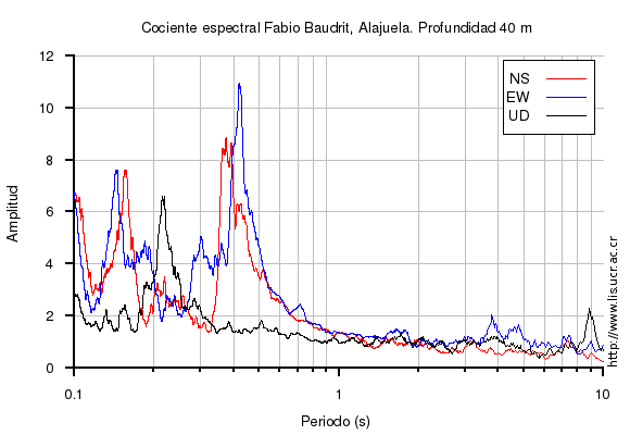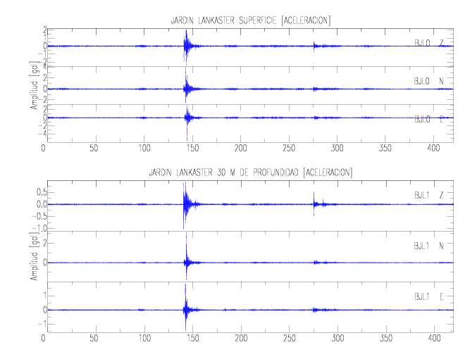 Aquí se muestran las formas de onda y cocientes espectrales de los sensores colocados en pozo . Uno se ubica en el Jardín Lankester en Paraíso de Cartago con 30 m de profundidad y el otro en la Estación Experimental Fabio Baudrit en Alajuela con 40 m de profundidad. La tabla muestra los valores de aceleración máxima (PGA) leídos de las tres componentes en superficie (N00) y en profundidad (N01)