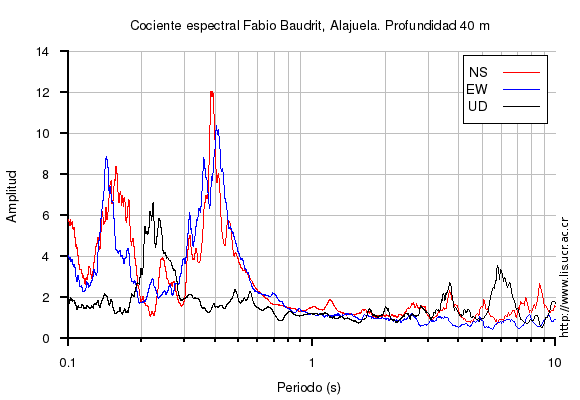 El cociente espectral se obtuvo dividiendo el espectro de amplitud de la componente en superficie con respecto a la componente en profundidad (NS=norte-sur, EW=este-oeste, UD=vertical)