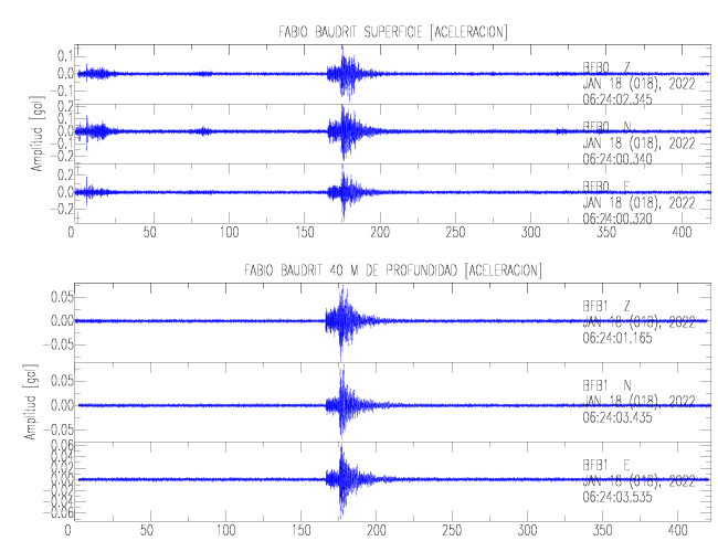 Aquí se muestran las formas de onda y cocientes espectrales de los sensores colocados en pozo . Uno se ubica en el Jardín Lankester en Paraíso de Cartago con 30 m de profundidad y el otro en la Estación Experimental Fabio Baudrit en Alajuela con 40 m de profundidad. La tabla muestra los valores de aceleración máxima (PGA) leídos de las tres componentes en superficie (N00) y en profundidad (N01)