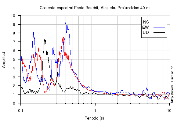 El cociente espectral se obtuvo dividiendo el espectro de amplitud de la componente en superficie con respecto a la componente en profundidad (NS=norte-sur, EW=este-oeste, UD=vertical)