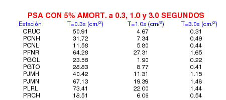 Esta tabla contiene los valores de PSA en cm/s2 calculados del espectro de respuesta con 5% de amortiguamiento a 1 segundo (se muestran los valores para aquellas estaciones que tuvieron un valor de aceleración superior a 5 cm/s2).