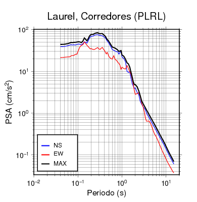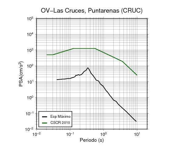 En los siguientes gráficos, la traza verde es el espectro propuesto por el CSCR-2010, la traza negra es el espectro máximo de este sismo. El valor de la amplitud está dado en pseudoaceleración en cm/s2.