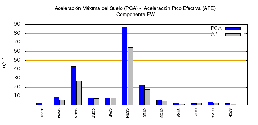 La siguiente tabla muestra los valores de aceleración efectiva para las componentes norte-sur (NS) y este-oeste (EW). También se muestra el valor del cociente entre la aceleración efectiva y la aceleración máxima (APE/PGA).