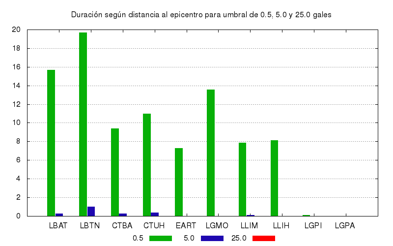 La duración para otros niveles de aceleración también se calculó. Este es el gráfico con los valores de duración para umbrales de 0.5, 5.0 y 25.0 gales. Se muestran los 10 primeros sitios ordenados por su cercanía el epicentro.