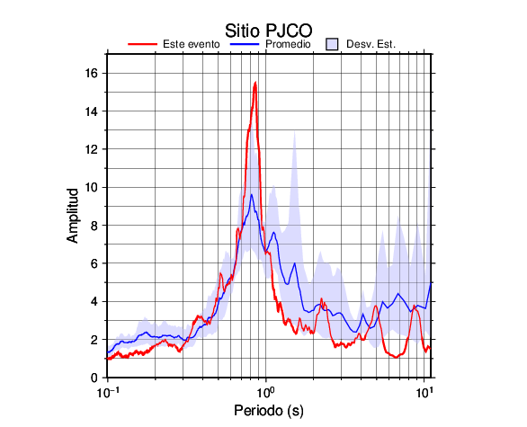 Los resultados que se presentan aquí fueron obtenidos luego de dividir las componentes horizontales entre la componente vertical (conocido como técnica H/V). Se grafica tanto el efecto de sitio del sismo registrado como el valor promedio en cada estación y su correspondiente desviación estándar.