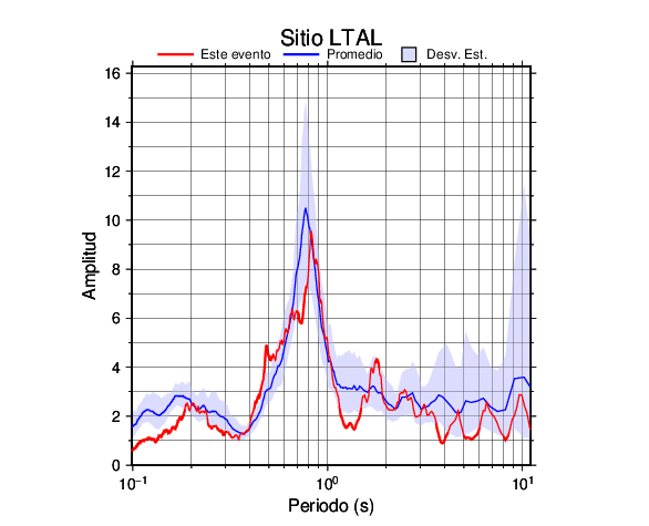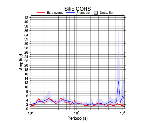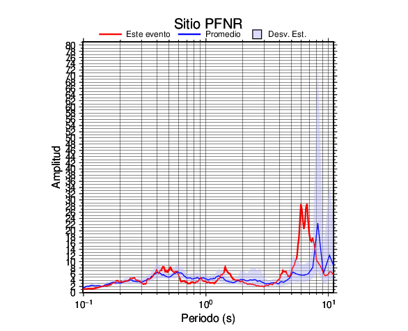 Los resultados que se presentan aquí fueron obtenidos luego de dividir las componentes horizontales entre la componente vertical (conocido como técnica H/V). Se grafica tanto el efecto de sitio del sismo registrado como el valor promedio en cada estación y su correspondiente desviación estándar.