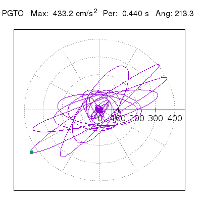 Tomando el periodo en el cual se presenta la amplitud máxima del espectro de respuesta máxima para cada estación, se representa la respuesta bidireccional en función del tiempo sobre el plano horizontal. Se identifica el punto (color verde en cada figura) del cual se desprende la orientación mostrada en el mapa de la sección superior. El valor de la acelereración máxima corresponde al punto del espectro de respuesta para el periodo indicado.