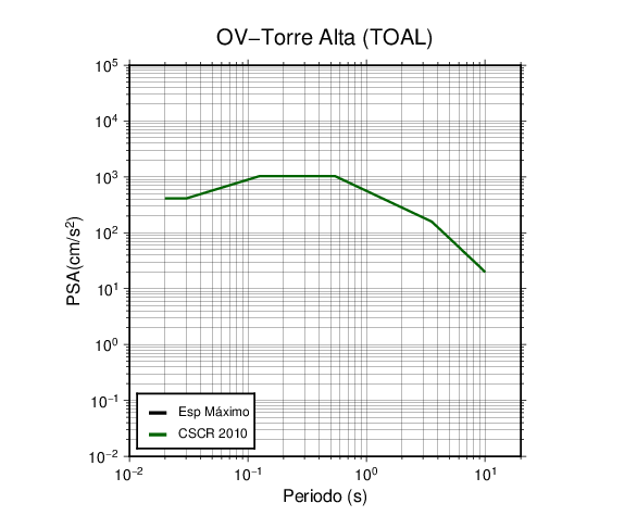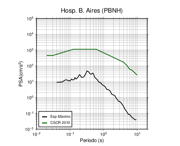En los siguientes gráficos, la traza verde es el espectro propuesto por el CSCR-2010, la traza negra es el espectro máximo de este sismo. El valor de la amplitud está dado en pseudoaceleración en cm/s2.