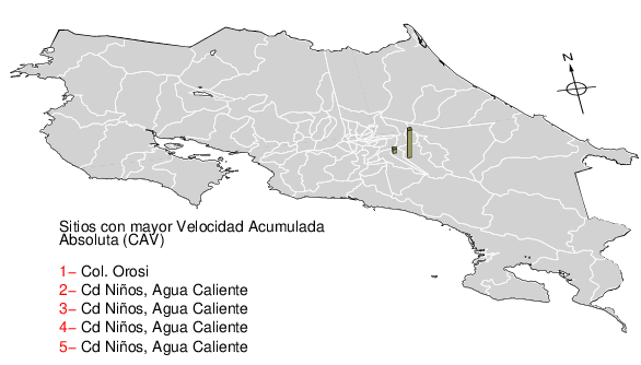 La velocidad acumulada absoluta (CAV por sus siglas en inglés) es otro parámetro que se usa para caracterizar el movimiento fuerte del suelo. Los datos están dados en cm/s para las componentes norte-sur (NS) y este-oeste (EW). El máximo de ambas se da en la tercera columna.
