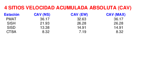La velocidad acumulada absoluta (CAV por sus siglas en inglés) es otro parámetro que se usa para caracterizar el movimiento fuerte del suelo. Los datos están dados en cm/s para las componentes norte-sur (NS) y este-oeste (EW). El máximo de ambas se da en la tercera columna.