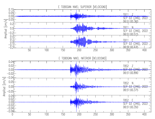 Los registros de velocidad se obtienen de la integración de los registros de aceleración y los de desplazamiento a su vez de la integración de los registros de velocidad. Las señales de ac, ve y de se han filtrado en el rango 0.5 a 10 Hz (0.1 a 2 s) con el fin que se puedan apreciar mejor sus gráficos.