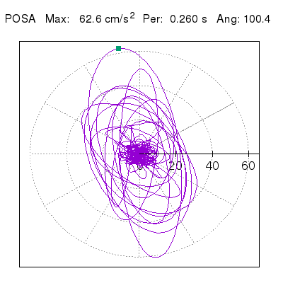 Tomando el periodo en el cual se presenta la amplitud máxima del espectro de respuesta máxima para cada estación, se representa la respuesta bidireccional en función del tiempo sobre el plano horizontal. Se identifica el punto (color verde en cada figura) del cual se desprende la orientación mostrada en el mapa de la sección superior. El valor de la acelereración máxima corresponde al punto del espectro de respuesta para el periodo indicado.