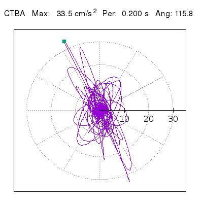 Tomando el periodo en el cual se presenta la amplitud máxima del espectro de respuesta máxima para cada estación, se representa la respuesta bidireccional en función del tiempo sobre el plano horizontal. Se identifica el punto (color verde en cada figura) del cual se desprende la orientación mostrada en el mapa de la sección superior. El valor de la acelereración máxima corresponde al punto del espectro de respuesta para el periodo indicado.