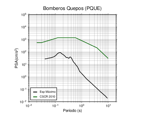 En los siguientes gráficos, la traza verde es el espectro propuesto por el CSCR-2010, la traza negra es el espectro máximo de este sismo. El valor de la amplitud está dado en pseudoaceleración en cm/s2.