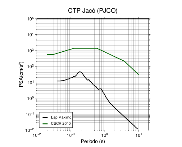 En los siguientes gráficos, la traza verde es el espectro propuesto por el CSCR-2010, la traza negra es el espectro máximo de este sismo. El valor de la amplitud está dado en pseudoaceleración en cm/s2.