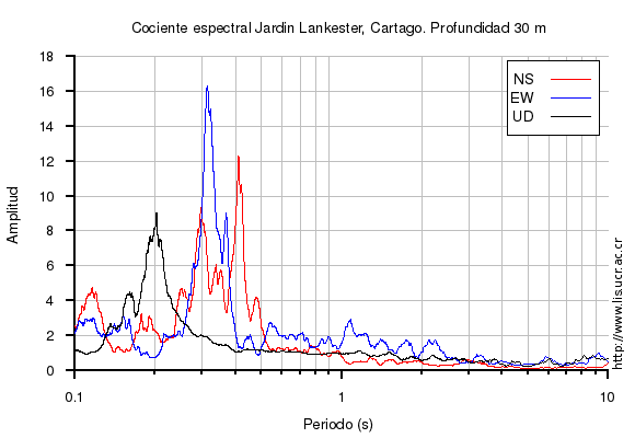 El cociente espectral se obtuvo dividiendo el espectro de amplitud de la componente en superficie con respecto a la componente en profundidad (NS=norte-sur, EW=este-oeste, UD=vertical)