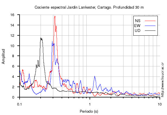 El cociente espectral se obtuvo dividiendo el espectro de amplitud de la componente en superficie con respecto a la componente en profundidad (NS=norte-sur, EW=este-oeste, UD=vertical)