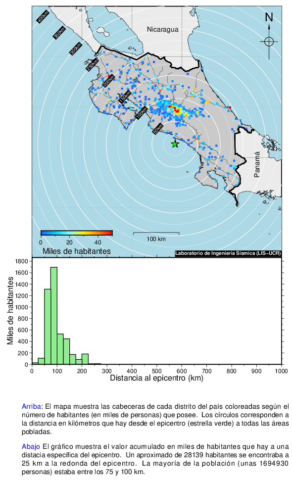 Este mapa muestra la ubicación del epicentro y la cantidad de habitantes que se encontraban a una cierta distancia de este. Los intervalos son de 25 km.