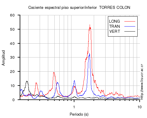 También se muestra el cociente espectral (en el rango de 0.1 a 10 s) entre el nivel superior (sea el último piso o la azotea) e inferior (sea el primero piso o el sótano) para cada una de las componentes LONG=longitudinal, TRAN=transversal y VERT=vertical. En los casos en que el nivel superior o inferior no estén disponibles al momento del sismo, se muestra una imagen con la leyenda "No se pudo calcular".