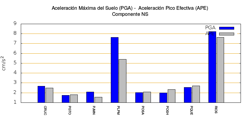 La siguiente tabla muestra los valores de aceleración efectiva para las componentes norte-sur (NS) y este-oeste (EW). También se muestra el valor del cociente entre la aceleración efectiva y la aceleración máxima (APE/PGA).