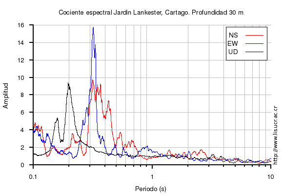 El cociente espectral se obtuvo dividiendo el espectro de amplitud de la componente en superficie con respecto a la componente en profundidad (NS=norte-sur, EW=este-oeste, UD=vertical)