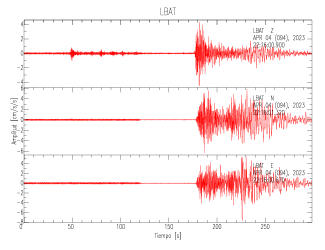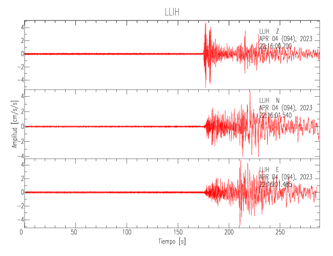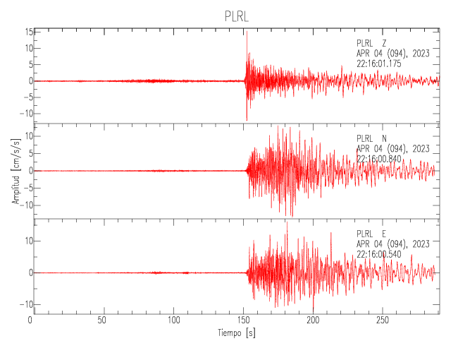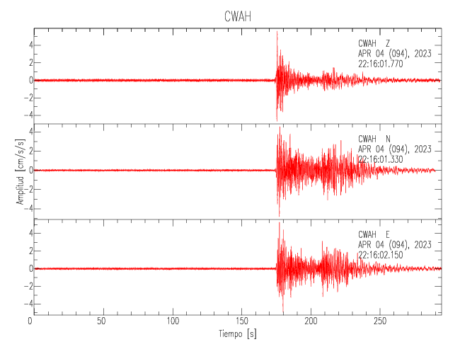 La siguiente tabla muestra los datos de aceleración máxima para cada componente en porcentaje de la aceleración de la gravedad (%g). Estos se obtienen dividiendo el valor del PGA registrado por 980 cm/s2 y multiplicándolo por 100. Los valores de las últimas dos columnas corresponden a la componente radial y transversal. Los datos se listan en orden descendente según el valor de la componente radial.