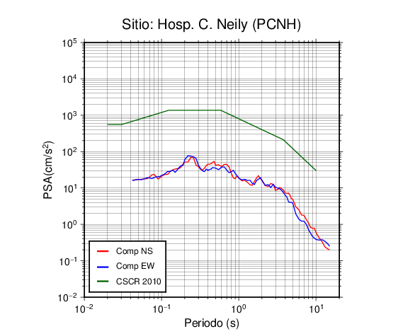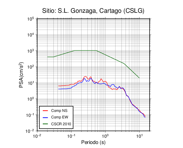 En los siguientes gráficos, la traza verde es el espectro propuesto por el CSCR-2010, la traza roja es el espectro de este sismo en la componente norte-sur (NS) y la traza azul la componente este-oeste (EW). El valor de la amplitud está dado en pseudoaceleración en cm/s2.