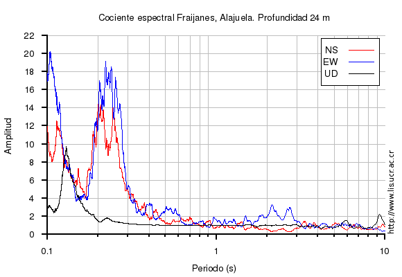 El cociente espectral se obtuvo dividiendo el espectro de amplitud de la componente en superficie con respecto a la componente en profundidad (NS=norte-sur, EW=este-oeste, UD=vertical)