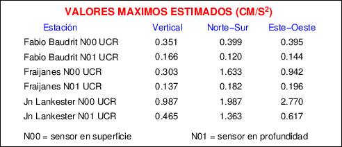 Aquí se muestran las formas de onda y cocientes espectrales de los sensores colocados en pozo . Uno se ubica en el Jardín Lankester en Paraíso de Cartago con 30 m de profundidad y el otro en la Estación Experimental Fabio Baudrit en Alajuela con 40 m de profundidad. La tabla muestra los valores de aceleración máxima (PGA) leídos de las tres componentes en superficie (N00) y en profundidad (N01)