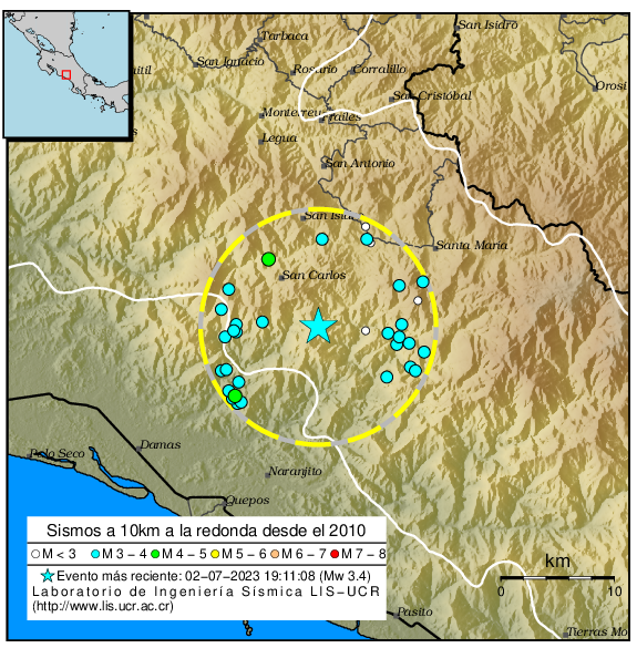 A 10km a la redonda del epicentro, el LISUCR ha localizado también los siguientes sismos ocurridos desde el 2010. Todos ellos con profundidades inferiores a los 40km.