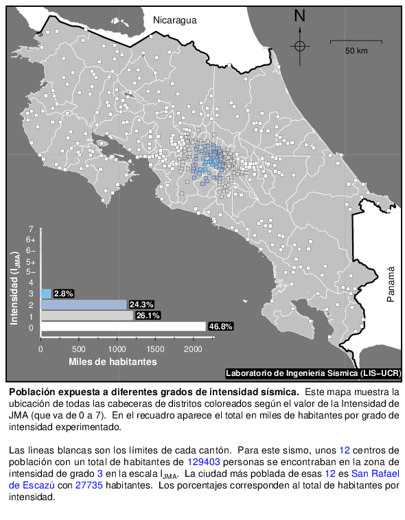 Cada punto sobre el mapa es la cabecera de un distrito. El número de habitantes que hay en cada uno se suma si se encuentra dentro de una misma zona de intensidad sísmica y el total se muestra en el recuadro en manera de porcentajes del total de la población y en miles de habitantes.