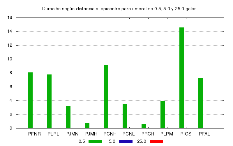La duración para otros niveles de aceleración también se calculó. Este es el gráfico con los valores de duración para umbrales de 0.5, 5.0 y 25.0 gales. Se muestran los 10 primeros sitios ordenados por su cercanía el epicentro.